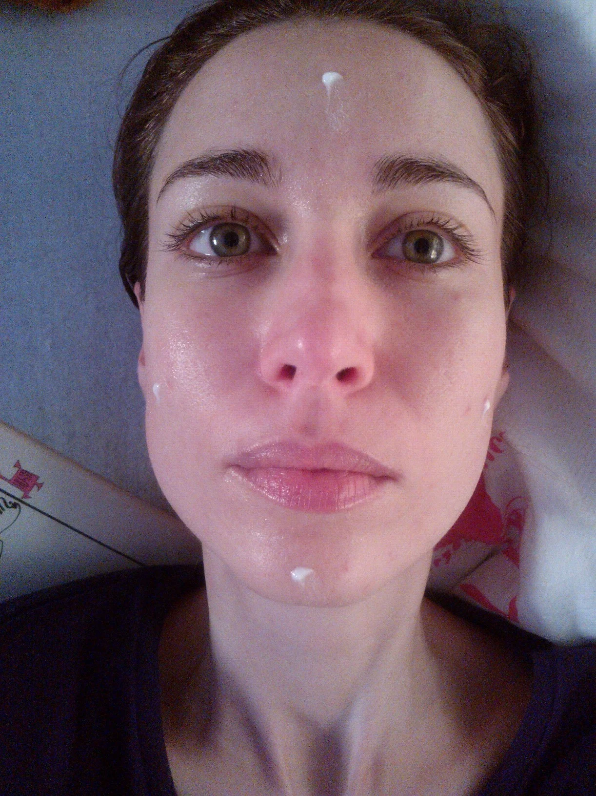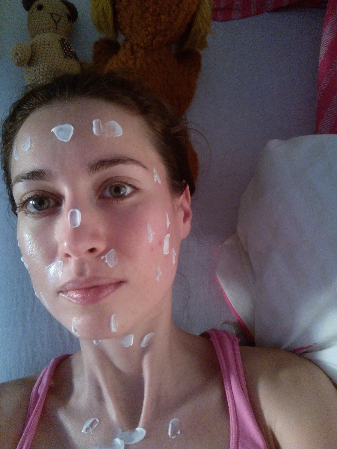 ..…rozotriem malé množstvo na všetky časti tváre, nevynechávam ani očné okolie